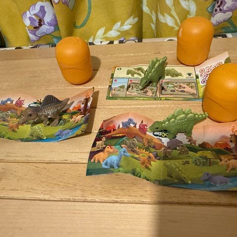 Myynnissä useita kappaleita jokaisesta dinosauruksesta, 1 €/kpl: