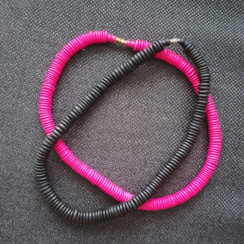 Haalean vaaleanpunaiset helmet saattavat olla aitoja mutta en mene takuuseen aitoudesta. Niljakkaita, kaipaavat pesua! Vanhan ajan lukoilla.