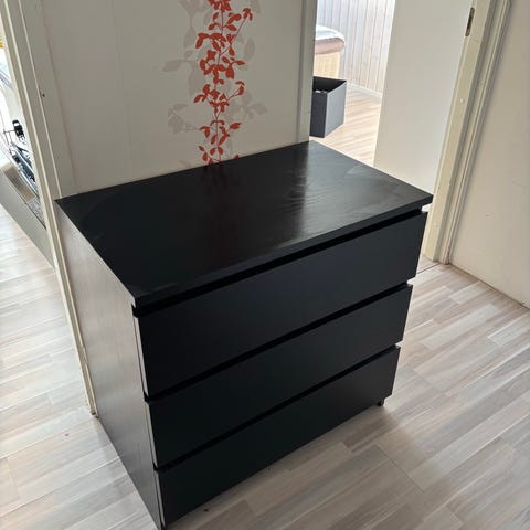 Hyväkuntoinen lipasto kolmella vetolaatikolla, saa laitettu lukkoon.