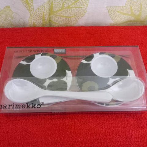 Marimekko Spring Ornament koriste / riipussetti sisältää kaksi keraamista riipusta. Koristeissa on nahkaripustimet ja ne on valmistettu valkoisesta keramiikasta värillisellä lasitteella. Kaksi koristetta, joista toisessa on kolmiulotteinen Unikko ja toisessa