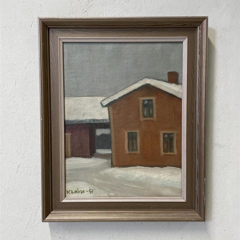 Isokokoinen öljyvärimaalaus kankaalle, signeerattu V Kivimäki vuonna 1975. Teos esittää talvista maisemaa, jossa on lato ja hevonen. Kehystetty yksinkertaisella kehyksellä. Reunassa pientä pintatahraa.