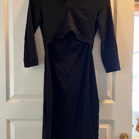 H&M Mama -malliston sievä imetysmekko. Koko S. Mekko on musta ja siinä on monivärinen kukkakuosi. Materiaali on pääosin viskoosia, vuori polyesteriä. Mallissa on 3/4-pituiset hihat ja vyötäröllä kiristettävä nauha.