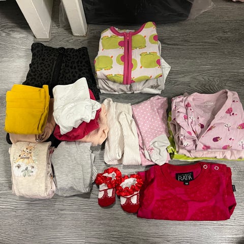 Vaatepaketti sisältää bodyja, housuja, puseroita, pyjamia ja muita vaatteita. Jotkut vaatteet ovat täydellisessä kunnossa, toiset ovat hyvässä kunnossa. Mukana on myös muutamia uusia vaatteita. Kaikki ovat puhtaita, ilman tahroja tai reikiä.
