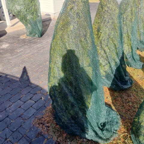 Varjoverkko ulkokäyttöön. Materiaalina tiheä akryyli kangasverkko , jossa on kahvin värisiä ja mustia säikeitä. Reunoissa on vahvistetut reunat ja metalliset purjerenkaat kiinnitystä varten. Soveltuu esimerkiksi piha- tai puutarha-alueen varjostamiseen tai näkösuojaksi. Kuvat 3-4