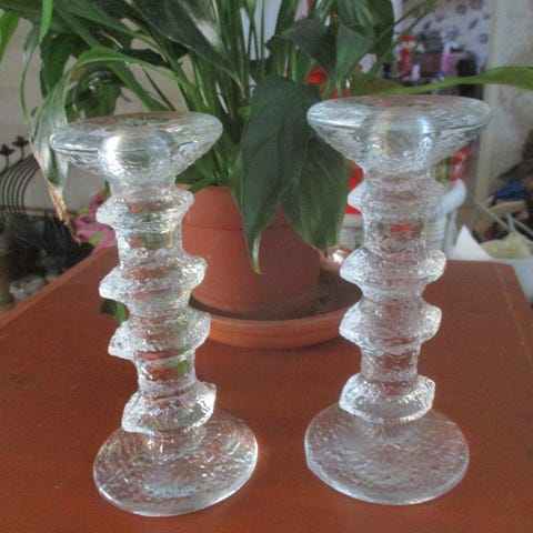 2 kpl Iittala Festivo 6-solmua kynttilänjalka. Timo Sarpaneva, signeerattu TS molemmat. Käytettyjä, vanhaa tuotantoa. Putsattu, mutta steariinia saattaa olla. Ehjät.