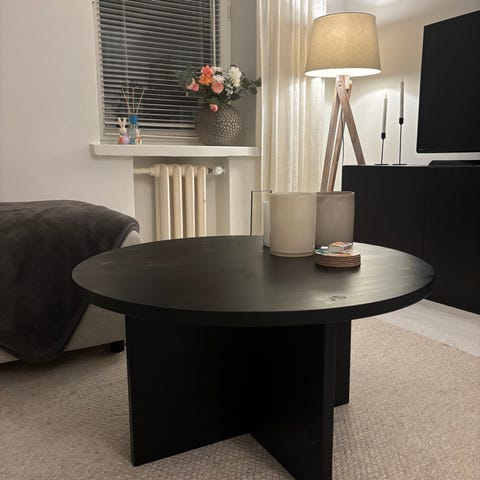 Pyöreä musta sohvapöytä. Ihan hyväkuntoinen muuten, mutta pöytälevyssä jonkin verran käytönjälkiä.
