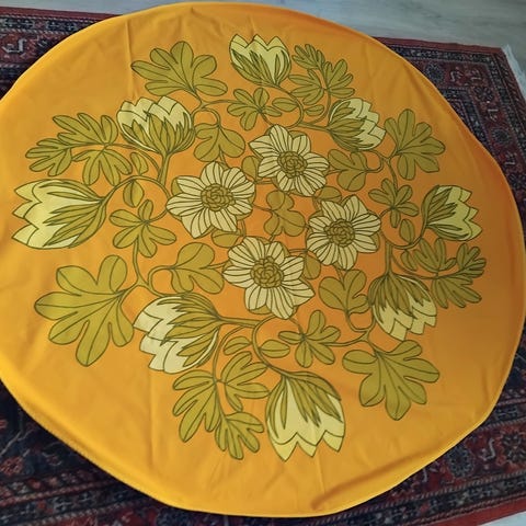 Myyntiin pyöreä vaaleanvihreä pöytäliina. Pöytäliinan halkaisija on 137cm. Hinta 10€.