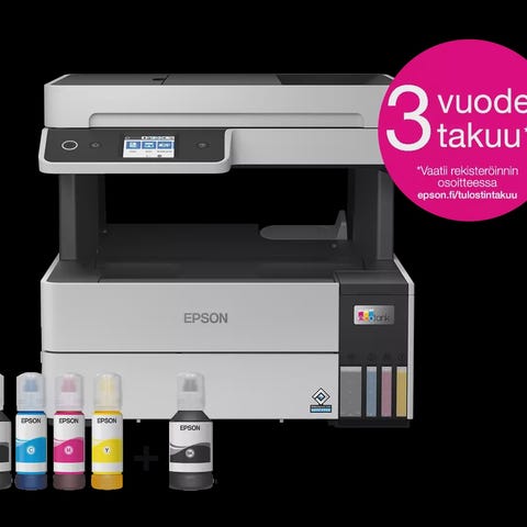 EPSON ECOTANK ET-5150 MONITOIMITULOSTIN Tämän tuotteen takuun voi laajentaa kolmeen vuoteen sekä yritys- että kotikäytössä, kun rekisteröit laitteesi osoitteessa www.epson.fi/tulostintakuu. Kampanja on voimassa 31.3.2025 saakka. Katso kampanjaehdot TÄSTÄ . Tulostimen vakiotakuu yrityskäytössä on 1 vuosi tai 100 000 sivua, kumpi ensin tulee täyteen.Yritystasoiset tulosteet EcoTank 113 -mustesarjan kaikki musteet ovat pigmenttimusteita, jotka kestävät hankausta, vettä ja korostuskyniä. Mukana toimitettavilla musteilla voi tulostaa jopa 13 300 mustavalkosivua ja 5 200 värisivua. Erittäin nopea tulostusTulosta, kopioi ja skannaaErittäin alhaiset sivukohtaiset kustannuksetTaloudellinen mustesäiliöjärjestelmäHelppokäyttöiset mustesäiliöt tulostimen etuosassaWi-Fi, Wi-Fi Direct, EthernetMaksuttomat mobiilitulostussovelluksetA4-koon monitoimilaite250 arkin paperilokero35 arkin automaattinen arkinsyöttölaiteKustannustehokas vaihtoehto laser-tulostimelle EcoTank ET-5150 A4-monitoimitulostin– Wi-Fi ja mustesäiliöt, tulosta jopa 13 300 mustavalko- ja 5 200 värisivua mukana toimitettavalla musteellaTämä A4-monitoimitulostin sopii kiireisiin kotitoimistoihin ja pienille yrityksille. Tulostimessa on helppokäyttöinen kosketusnäyttö, ja sen uudelleentäytettävät mustesäiliöt takaavat erittäin edullisen tulostuksen. Tulostimen muita hyödyllisiä ominaisuuksia ovat muun muassa Wi-Fi-yhteys, automaattinen kaksipuolinen tulostus, suuri paperilokero, 35 arkin automaattinen arkinsyöttölaite sekä korkea tulostusnopeus.Tämä kotitoimistoihin ja pieniin yrityksiin sopiva A4-koon monitoimitulostin tarjoaa erittäin alhaiset sivukohtaiset tulostuskustannukset sekä korkeat tulostusnopeudet. Tulostimessa on 250 arkin paperilokero, 6,1 cm:n LCD-kosketusnäyttö sekä 35 arkin automaattinen arkinsyöttölaite, joiden ansiosta tulostus on aina sujuvaa.Tee enemmän nopeamminNosta kotitoimistosi uudelle tasolle tällä erittäin nopealla ja tehokkaalla tulostimella, joka tulostaa ensimmäisen sivun vain 7 sekunnissa.Monipuolinen A4-koon EcoTank-tulostinET-5150-tulostimella voit tulostaa, kopioida ja skannata. Lisäksi siinä on kaksipuolinen tulostus, 250 arkin paperilokero sekä 35 arkin automaattinen arkinsyöttölaite. Monipuolisia toimintoja on helppo käyttää 6,1 cm:n LCD-kosketusnäytöllä.Jatkuvaa säästöäSäästät aina, kun tulostat tällä EcoTank-tulostimella, sillä se takaa uskomattoman alhaiset sivukohtaiset kustannukset. Toisin kuin muissa tulostimissa, EcoTank-tulostimissa on suuret mustesäiliöt, jotka täytetään edullisilla mustepulloilla.Laadukkaat tulosteetEcoTank 113 -mustesarjan kaikki musteet ovat pigmenttimusteita, jotka eivät tuhriinnu ja kestävät vettä ja korostuskyniä. Mukana toimitettavat musteet riittävät jopa 13 300 mustavalko- ja 5 200 värisivun tulostamiseen.Tulosta lähes mistä vainTulostimessa on Wi-Fi- ja Wi-Fi Direct -yhteydet, joten voit lähettää asiakirjoja tulostettaviksi suoraanälylaitteista Epson iPrint- ja Smart Panel -sovelluksilla. Lisäksi tulostimessa on myös Ethernet-liitäntä.Helppokäyttöinen ja luotettavaMustesäiliöiden täyttäminen on helppoa uudelleensuljettavien ja tippasuojattujen mustepullojen ansiosta. Epsonin ainutlaatuinen lämmötön PrecisionCore-tekniikka parantaa luotettavuutta, vähentää käyttökatkoja ja pienentää ympäristövaikutuksia. Ei lämpenemisaikaa, joten ensimmäinen sivu tulostuu nopeasti ja vähemmällä virrankäytöllä.Nopeaa ja aikaa säästävää tulostustaTulostusnopeus jopa 17 sivua minuutissaA4-monitoimitulostin kosketusnäytöllä ja automaattisella arkinsyöttölaitteellaKorkealaatuinen tulostus, kopiointi ja skannaus yhdellä laitteella sekä suuri paperilokero helpon käytön varmistamiseksiUseat liitäntävaihtoehdot mahdollistavat helpon tulostamisen mistä tahansaEpson Smart Panel -sovelluksen avulla voit asentaa tulostimen, tulostaa ja paljon muuta suoraan mobiililaitteestasiMuka