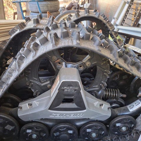 T1B luokan Traktorimönkijä, kulkee 60kmh ja saa ajaa 15v. Kattavasti varusteltu ja juuri huollettu, joten suoraa valmiina työntekoon. Telasarjalla pääset sellaisiin paikkoihin joista et ole aikaisemmin edes haaveillut! Apachen telasarjassa on kestovoidellut laakeri eikä ns. liukumuoveja joten näillä voit ajella kesälläkin. Näillä pääsekin kiertämään pehmeät paikat, kun kantopintaa on huomattavasti enemmän kuin renkailla.