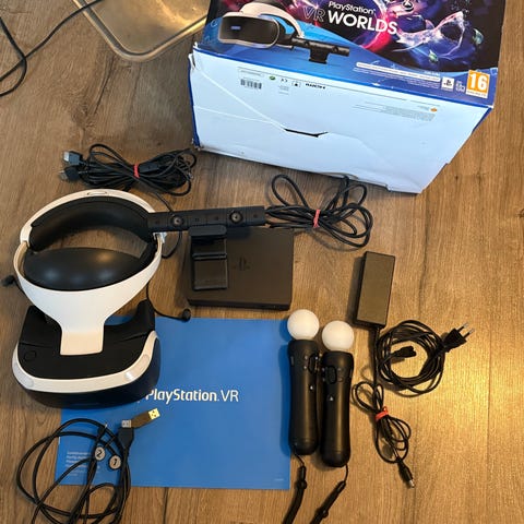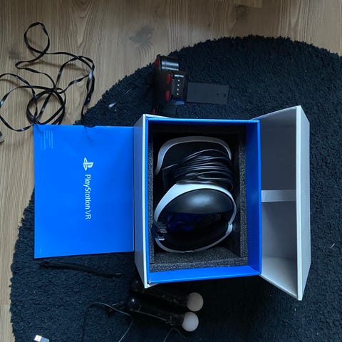 Sony PlayStation 4 VR virtuaalilasit. Mukana virtuaalilasit, prosessoriyksikkö, virtalähde ja kaapeleita. Kuvassa näkyy lisäksi useita liikeohjaimia ja kameramainen lisälaite, jotka on tarkoitettu yhteensopivaan PlayStation-konsoliin käytettäväksi virtuaalitodellisuuspeleissä ja -sovelluksissa.