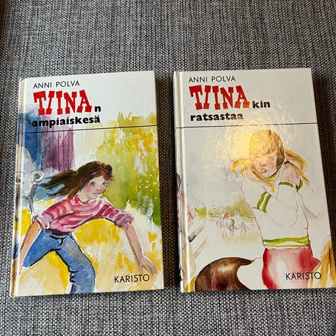 Anni Polvan Tiina -kirjat, yhteensä 2 kappaletta. Kovakantisia nuortenkirjoja, joissa värikuvitettu kansi. Sopivat luettavaksi esimerkiksi alakouluikäisille ja nuorille lukijoille.
