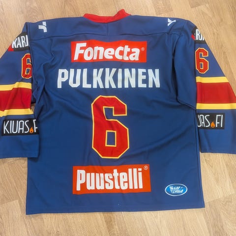 Reebok Jokerit jääkiekkopelipaita koossa SR XL. Paita on sininen-punainen keltaisilla yksityiskohdilla ja edessä on suuri Jokerit-logo. Hihat ja sivut ovat moniväriset, ja toisessa hihassa on useita mustalla tussilla tehtyjä nimikirjoituksia. Materiaali on hengittävää verkkokangasta, joka on tyypillinen jääkiekkopelipaidoille. Sopii käytettäväksi jääkiekon pelipaitana tai fanipaitana.