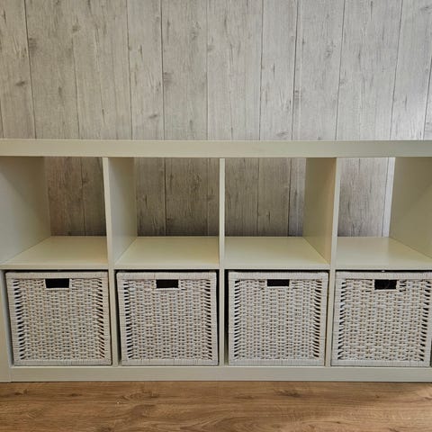 Erinomaisessa kunnossa oleva Ikean valkoinen kallax hylly, jossa asennettuna kahdet upotettava laatikostot.