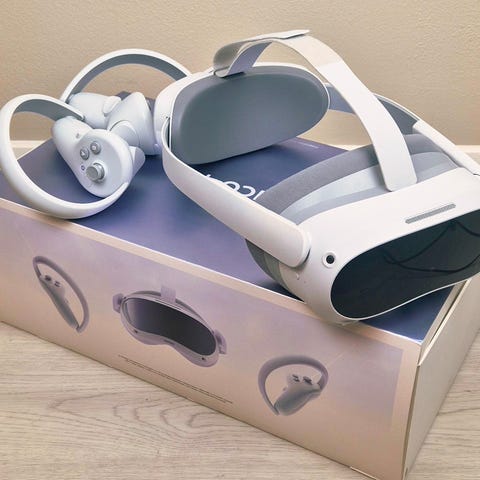 Pakettiin kuuluu valkoiset virtuaalilasit kiinteällä kaapelilla sekä kaksi käsiohjainta liipaisimilla ja rannelenkeillä.