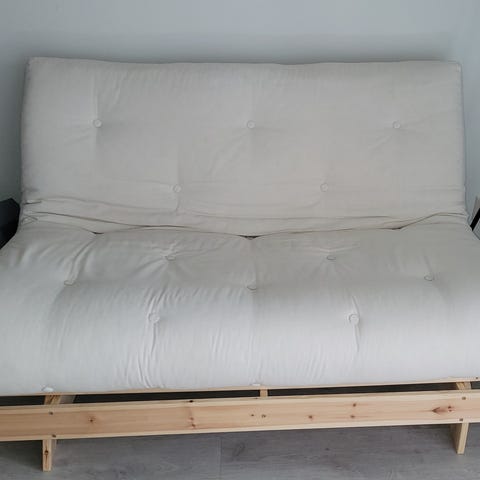 Karup Design roots -vuodesohva. Vaalea mäntypuun värinen runko, patja pellavan värinen ("linen"). Patjakoko 200x140cm, korkeus 12cm. Runko on mäntyä ja patjan kangas 75% puuvillaa ja 25% pellavaa. Helposti levitettävissä vuodesohvaksi. Kunto kuin uusi.