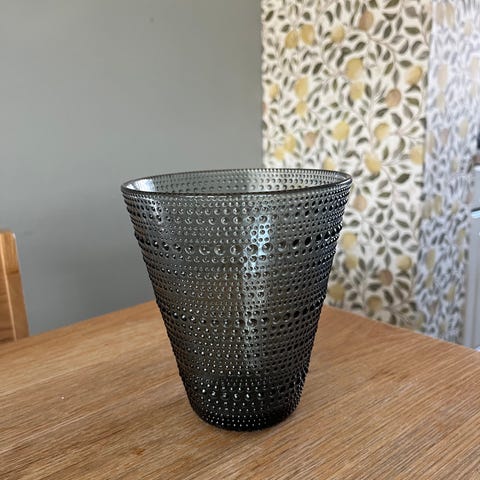 Nuutajärven lasin (nyk. Iittala) Kastehelmi kääntömaljakko. Vanhempaa tuotantoa, joten todellisuudessa väri ei noin kirkas kuin kuvissa.