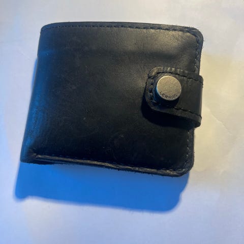 Vanha, isokokoinen nahkainen lompakko. Lompakossa useita lokeroita. Tarkkaa tietoa ei ole kuinka vanha lompakko on, saattaa olla 1800 luvultakin, kulkenut suvun mukana. Avattuna leveys 38cm, tämä taittuu kolmeen osaan, korkeus 20cm. Lokerot sisustettu kankaalla.