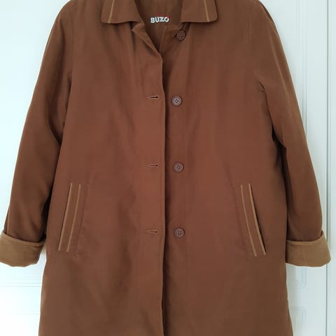 Siisti ja tyylikäs puolipitkä takki vaikka juhlaan. Polyesterivuori, päällikangas puuvillaa ja polyamidia. Hienopesu 30 asteessa. Takin väri on tasaisen musta, vaikka kuvissa pientä epätasaisuutta havaittavissa. Takin pinta on hivenen kiiltävä, joka ilmeisesti sai aikaan tämän haasteen kuvaukseen. Kapea vyö, joka kulkee takin sisällä, kujaa pitkin ympäri. Vyön voi irroittaa ja vaihtaa. Vyössä paikoin kulumaa, mutta voi vielä käyttää. Takki on hyväkuntoinen. Vyö 1.9 cm leveä. Vetoketju ja lisäksi näppärit vetoketjun yläpuolella ja alapuolella, joten vetoketju pysyy piilossa.