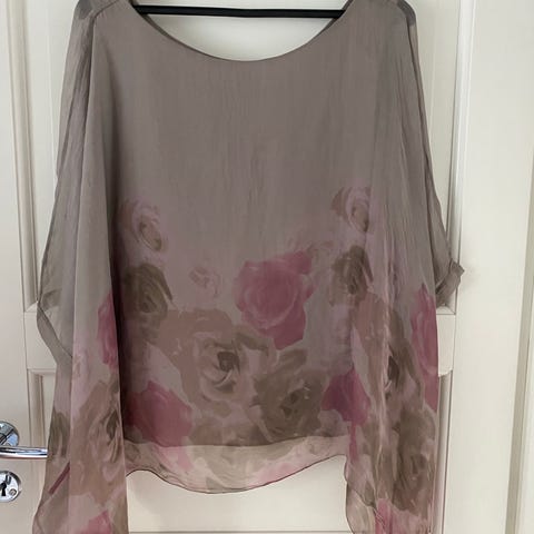 Silkkipusero, valmistettu ohuesta silkistä. Väriltään vaaleanpunainen, läpikuultava materiaali. Koko one size, väljä ja laskeutuva malli, jossa leveät hihat. Sopii naisille. Puserossa on kevyt, ilmava rakenne ja sen alla kiinteä toppi.