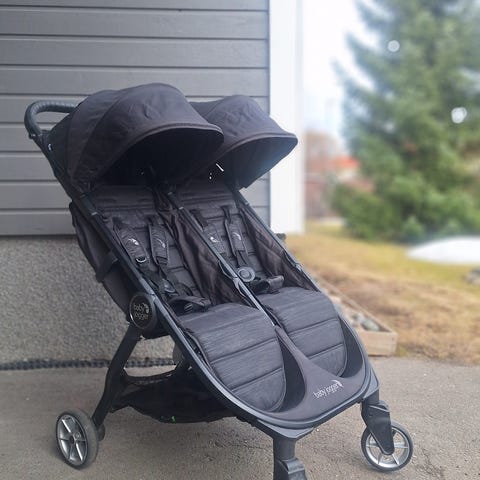 Cosatto tuplarattaat. Selkänojia saa säädettyä lepoasentoon saakka. Mukaan kuuluu sadesuojat, juomapulloteline ja suojapussit jaloille. Säilytetty sisällä.
