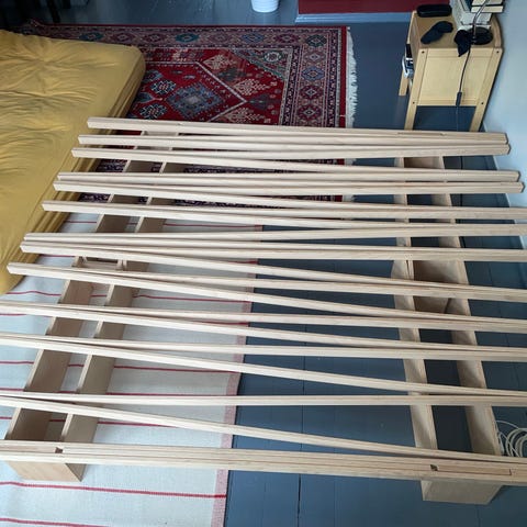 Huom. Sänky nitisee kun siitä nousee ylös, nukkuessa se ei häiritse. Nitinän aiheuttaa jalkojen hankaus kiinnityskohtiin, asian saa kenties korjattua silikonisprayta käyttämällä.
