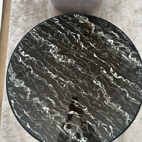 Myydään hyväkuntoinen Apollo -marmorikantinen pyöreä sohvapöytä. Jalka valurautaa.