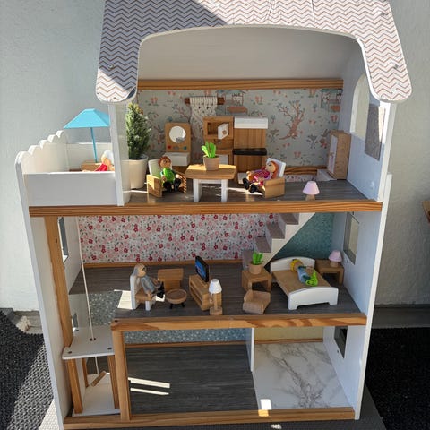 Myydään ihana ja paljon leikitty nukkekoti. Mukaan muuntaja valaisimia varten sekä kalusteet, eläimet ja nuket.