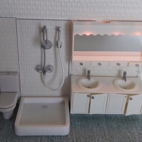 Puinen parisänky alkuperäisillä vuodevaatteilla sekä yöpöydät nukkekotiin.
