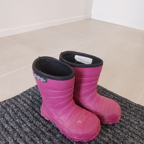 Stormberg lasten lämpökumisaappaat, koko 23. Violetti väri ja harmaa vuori. Saappaissa on kuvioitu pohja paremman pidon takaamiseksi ja varren pituus on keskikorkea. Ehjät ja hyväkuntoiset