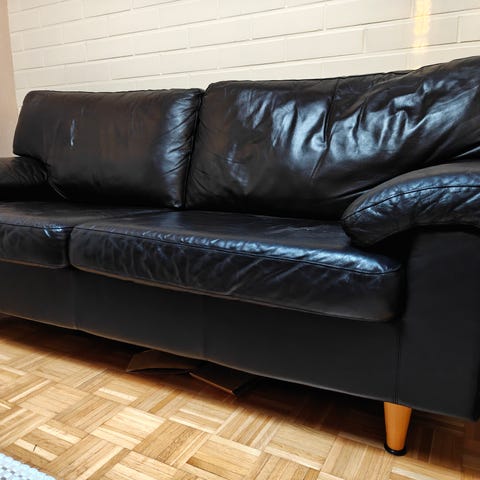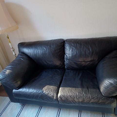 Hieman kulumaa istuintyynyissä ja repeämä selkänoja tyynyjen välissä.