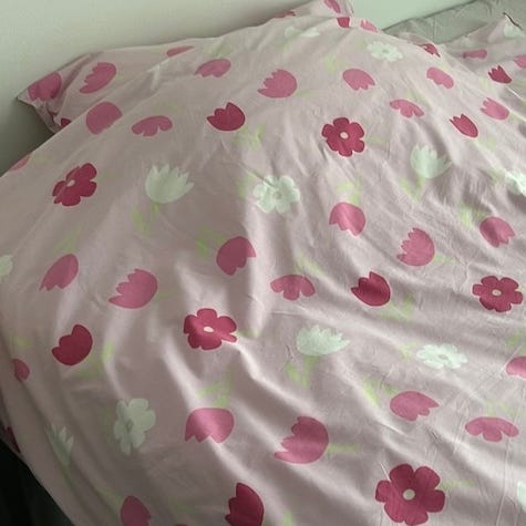 Finlayson pussilakanasetti, jossa tumma pohjaväri ja vaalea kukkakuosi. Materiaalina puuvilla. Sopii yhden hengen vuoteeseen. Kuviointi on molemmin puolin samanhenkinen. Setti sisältää pussilakanan ja tyynyliinan, pakkauksissa näkyvien tietojen mukaan yhteensopivalla kuosilla.