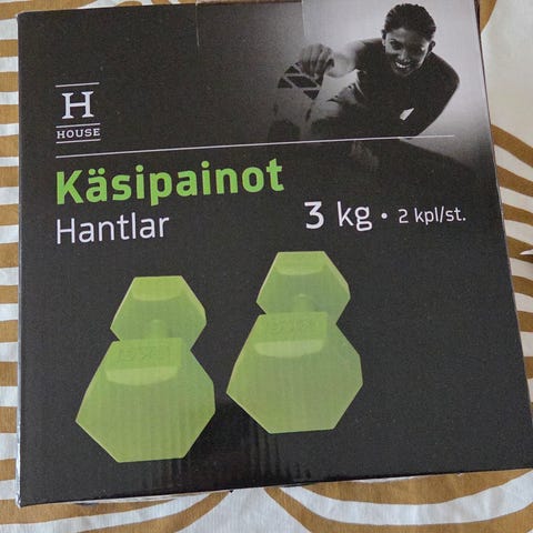 Myydään yhdessä 2 kpl Käsipainot 3 kg. Neopreenipäällysteiset violetit käsipainot.