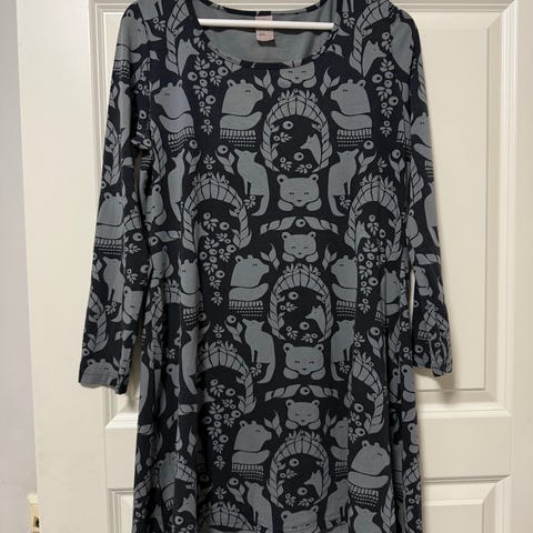 Musta mekko, jossa valkoinen graafinen kuosi. Valmistettu luomupuuvillasta.