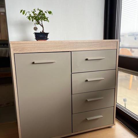 Pääosin puinen kaappi. Nyt maalattu, uudet vetimet vaihdettu. Hajuton, siisti myös sisältä. Kuljetusmahdollisuus lähialueelle.