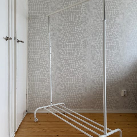 Uutta vastaava Jyskin vaaterekki myydään tarpeettomana. Pyörät alla, helppo siirrellä, korkeus säädettävissä.