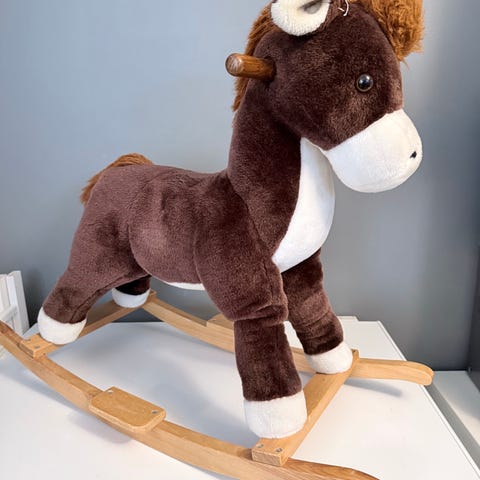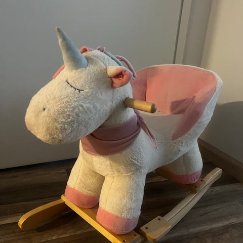 Oikein siiskuntoinen Jabadabado-merkkinen pehmeä yksisarvinen keinuhevonen.