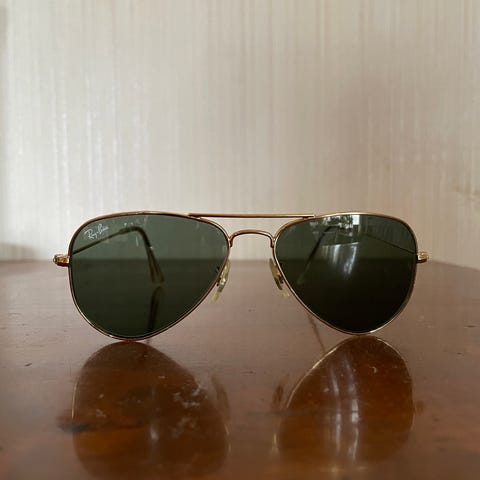Myydään Ray-ban aviator-aurinkolasit. Hyvässä kunnossa. Oikein läheltä katsottuna joitain käytön jälkiä näkyy, mutta linssit täysin naarmuttomat. Kuvissa linsseissä pölyä.