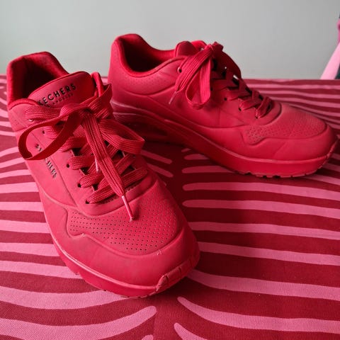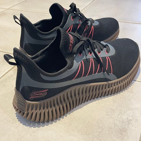 Skechers vapaa-ajankengät, koko 43. Mustat nauhalliset kengät, joissa verkkomainen päällinen ja kumipohja. Sopivat monipuoliseen vapaa-ajan käyttöön ja kevyeen liikuntaan. Skechers-logo sivussa ja vetolenkit kantapäässä helpottamassa pukemista. Kengät käytetyt, joten pientä käytön jälkeä löytyy. Kengät myös pesty myyntiä varten.