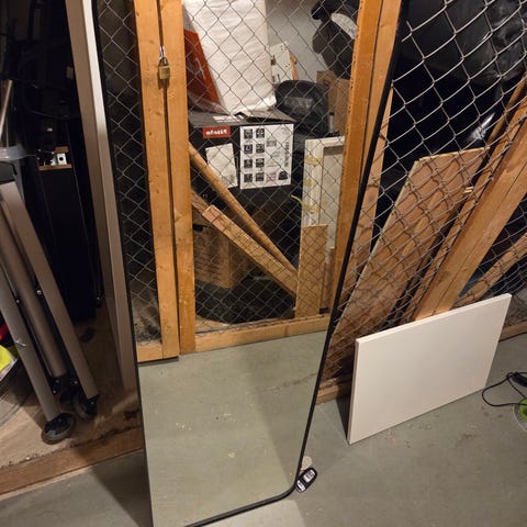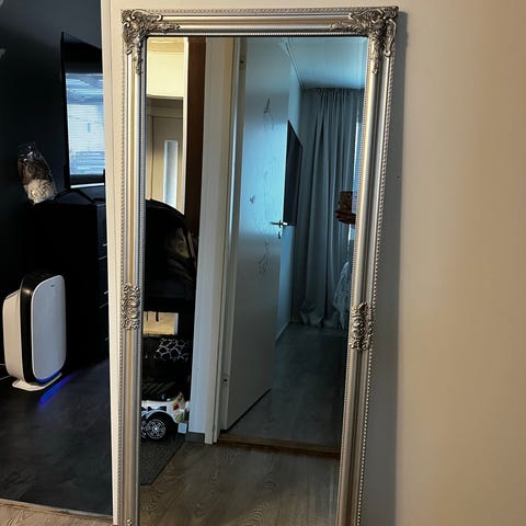 Kevytrakenteinen peili. Yläreunassa koukut ripustukseen.