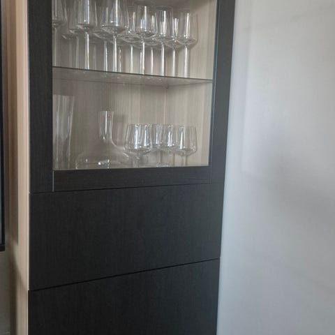 Ikean bestå vitriinikaappi. Kaksi ovea lasia ja kaksi ovea umpiovia. Muuten hyvässä kunnossa, mutta kaapin yläosassa jotain kulumaa ja toisessa umpi ovessa jokin viiru. Yleisilmeeltä siistissä kunnossa.