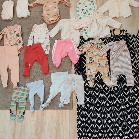 50-56cm hyväkuntoisia vaatteita kesävauvalle (Newbie, Lindex, Petit Bateuau, Pop, Name it, Knopf im ohr). Raitamekossa vähän kellastumaa kauluksessa, pallohaalari vähän nyppyyntynyt, hihattoman bodyn kaulus hieman värjääntynyt pesussa. Muita moitteita en löydä.