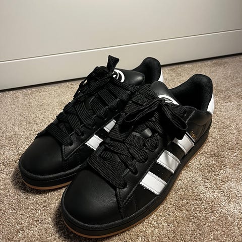 Adidas Campus tennarit, koko 42. Väriltään mustat, vaalealla pohjalla ja nauhakiinnityksellä. Sivussa Adidas Campus -teksti ja kantapäässä Adidas-logo. Soveltuvat arkikäyttöön ja vapaa-aikaan.