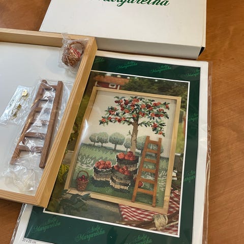 Myydään uusi Atelje Margarethas-tuotemerkin ristipistopakkaus; jonka avulla voi luoda kuvassa näkyvän seinäkellon. Pakkaus sisältää tarvittavat materiaalit ja ohjeet kellon valmistamiseen. Myynnissä myös muualla.