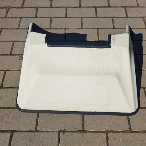 Valkoinen lasikuituinen perämoottorin äänisuoja.