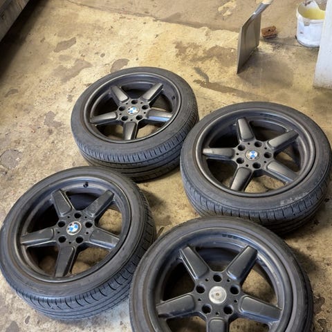 Nurkista pois pölyttymästä kuvienmukaiset bemarin orkkisvanteet huonohkoilla goodyearin 225/50/17 kitkarenkailla. Itse vanteissa ei juurikaan ihottumia löydy. Suurimmat varastointipölyt huuhtaistu pois mutta tarkempi pesu jääköön ostajalle.