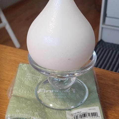 Finnmarin Lasisinen kynttilänjalka, kirkasta lasia. Muotoilultaan matalat ja leveäreunaiset, keskellä syvennys kruunukynttilälle tai vastaavalle. Sopivat esimerkiksi pöytä- tai ikkunakoristeeksi sekä osaksi kattauksia. Kork 7 cm, halka 9,5 cm