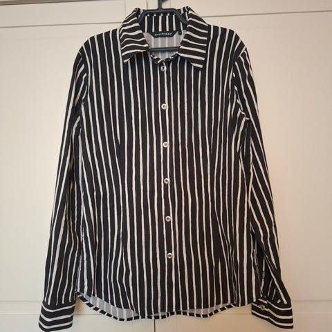 Mika Piirainen/ Marimekko. Jokapoika paita tyylinen paitapusero eli puuvillaa, 3 värinen, suorat hihat, halkiot sivulla. Kokomerkintä S. Hyvin vähän käytetty siisti pesty. Ei sovituksia, ei toridiiliä, en tingi. mallinukke 36/S kokoa. Niska -helma 68cm, kai-kai 50cm, kainalo -hihansuu 43cm. Nouto tarkka aika etukäteen sovitusti ma-pe kl.10-16 Hki 88 tai postitse pakettina.