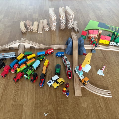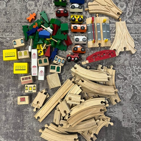 Myydään iso setti puista junarataa ja rataosia ym. Mukana BRIO ja muita yhteensopivia osia.