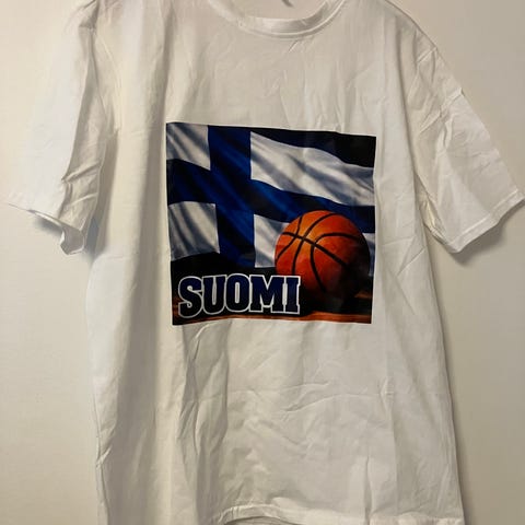 Finland Basketball t-paita miehille. Väri valkoinen, siniset reunukset hihoissa ja kauluksessa. Koko L. Edessä Finland Basketball -teksti ja koripalloaiheinen logo. Sopii vapaa-aikaan ja urheilun seuraamiseen. Materiaalista ei ole tarkkaa tietoa, mutta paita on kevyttä ja ohuen oloista kangasta.