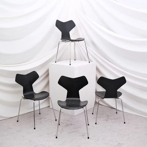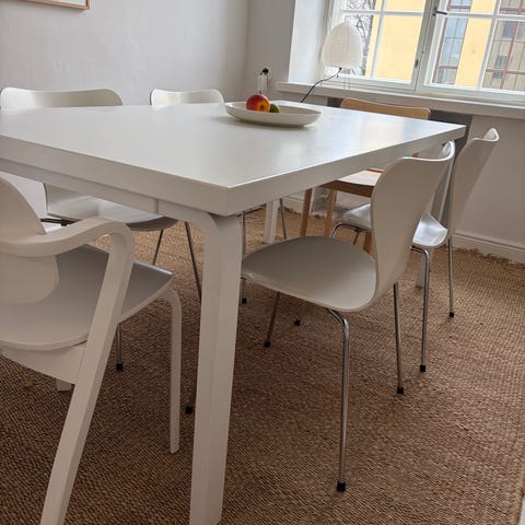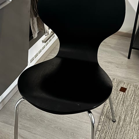 Fritz Hansen Series 7 -tuoli, suunnittelija Arne Jacobsen. Kaksi tuolia, joissa muotoon puristettu puuviilusta valmistettu istuin ja selkänoja sekä metallijalat. Toisen tuolin väri on punainen ja toisen vaalea puunsävy. Tuolit soveltuvat esimerkiksi ruokapöydän tai työpisteen istuimiksi. Kuvissa näkyy kulumaa ja reunavaurioita istuimissa.